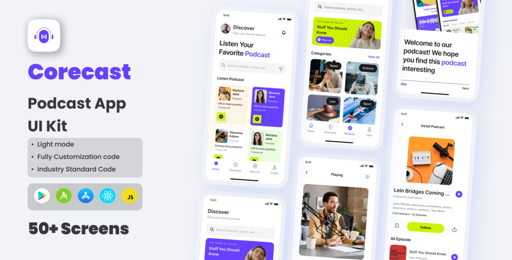 The Corecast UI Kit comes with a plethora of features aimed at enhancing user engagement and retention. It includes screens for browsing podcasts, detailed podcast information, episode lists, playback controls, user profiles, and settings. Each screen is designed with a focus on usability, ensuring that users can effortlessly navigate through the app. The playback controls are designed to be intuitive, providing users with an easy way to play, pause, skip, and rewind episodes. Additionally, the UI Kit supports custom themes, allowing developers to tailor the app’s appearance to match their brand identity.