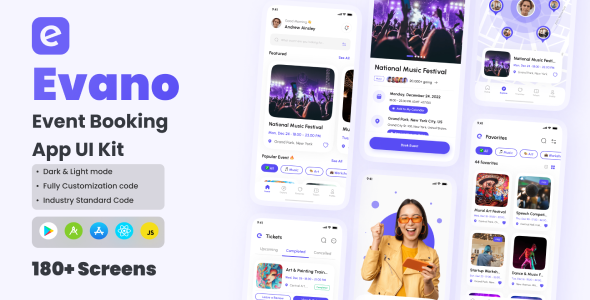 With Evano-Event Booking React Native CLI Ui Kit, you can quickly create a professional-looking event booking app that allows users to browse and book events, view event details, manage bookings, and more. The toolkit includes a range of features such as event listings, event details, event booking, user profiles, payment integration, and social media sharing.